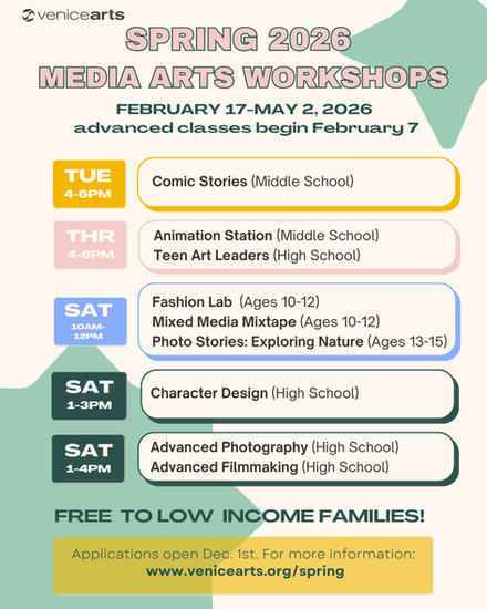 Venice Arts’ Spring 2026 Media Arts Workshops are open to youth ages 10–18 and include hands-on instruction in: